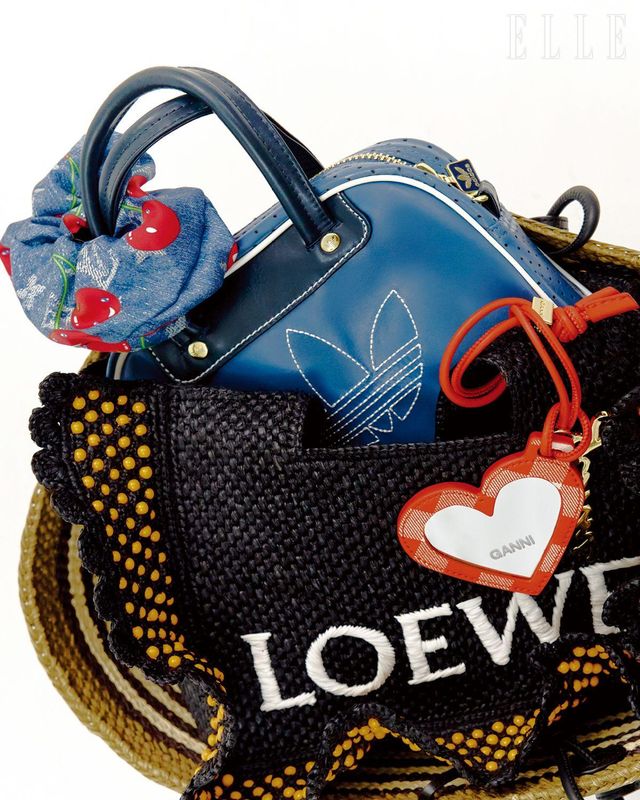 애너그램 자수 바스켓은 1백60만원, 비즈 러플이 특징인 토트백은 2백90만원, 모두 Loewe. 체리로 장식한 LV X TM 데님 스크런치는 52만원, Louis Vuitton. 아디다스 트레이닝화에서 영감받은 미니 볼링 백은 5만9천원, Adidas Originals. 하트 셰이프의 미러 참은 18만4천원, Ganni by Beaker.