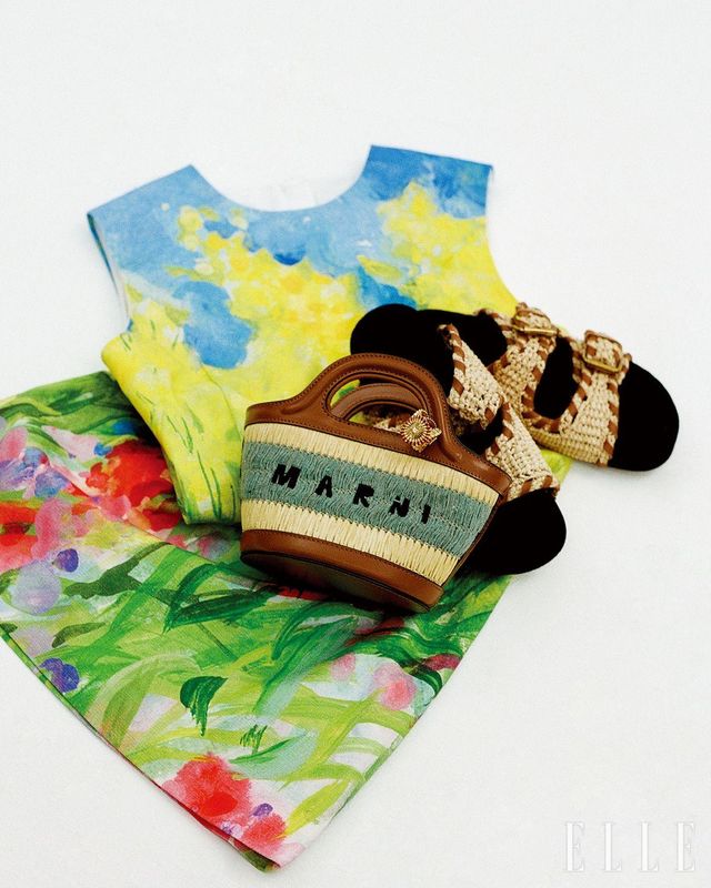 플라워 프린트 드레스는 가격 미정, Msgm. 라피아 플랫 샌들은 가격 미정, Isabel Marant. 골드 링은 가격 미정, Burberry. 라피아 이펙트 마이크로 백은 1백16만원, Marni.
