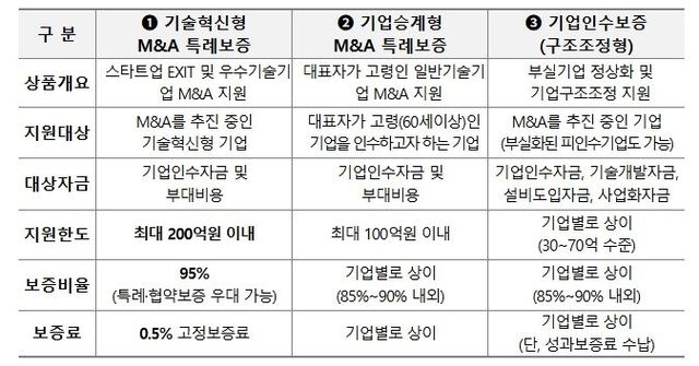 이에 중기부는 금년 1월부터 기술보증기금 내에 「인수합병(M&A)지원센터」를 설치하여 일반 인수합병(M&A) 지원은 물론, 자녀승계가 어려운 고령의 대표들에게 인수합병(M&A)을 통한 제3자 기업승계를 돕고 있다. 동 센터는 ▲인수합병(M&A) 거래정보망 운영, ▲중개지원, ▲인수합병(M&A) 파트너스 네트워크 구축, ▲인수합병(M&A) 보증, ▲기술보호(TTRS 등) 등 원활한 제3자 기업승계 서비스를 제공하고 있다.