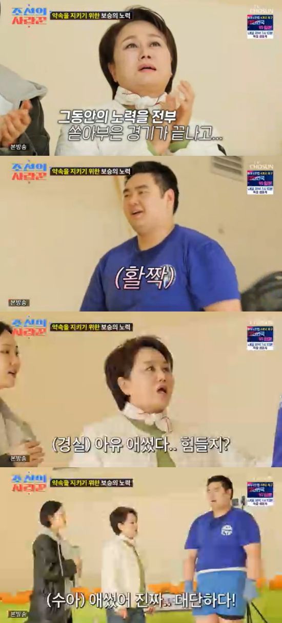 또 손보승은 경기가 끝나자마자 이경실과 손수아를 찾았고, 손수아는 "보승아 고생했다. 엄마가 너무 떨려가지고 손을 떤다"라며 귀띔했다. 이경실은 "애썼다. 힘들지?"라며 다독였고, 손수아는 "애썼다, 진짜. 대단하다. 잘했다"라며 칭찬했다.