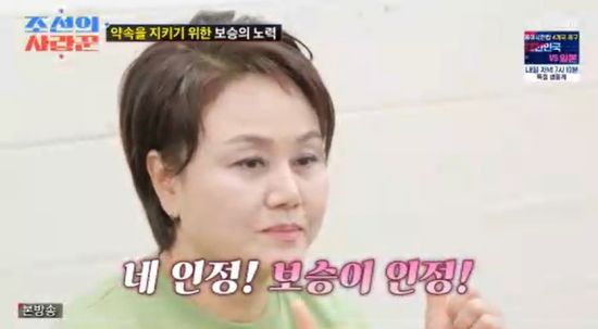이경실은 "제가 예전에 보승이를 받아들일 때 '가장으로서 자세가 되어 있으려면 너의 건강을 지켜야 된다. 넌 이제 아빠니까 아빠로서 건강한 몸을 유지해라' 이런 이야기를 했었는데 그동안 봤을 땐 몸무게가 별로 변화가 없는 거 같아서 하다말다 하다말다 한 거 같다 그런 생각이 들었는데 '권투로 다져진 몸이었구나'라는 생각이 드니까 기특하고 대견하고 믿음이 간다"라며 감탄했다. 제작진은 "인정해 주시는 거냐"라며 질문했고, 이경실은 "보승이 인정"라며 못박았다.