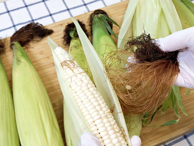 옥수수수염을 한데 모아서 위로 쭉- 잡아당겨요.