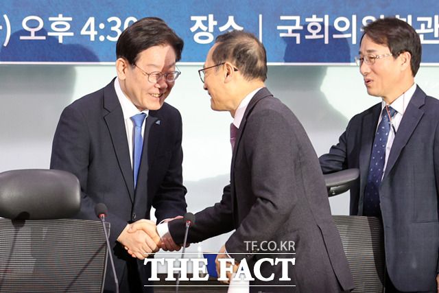 이재명 대표 체포동의안 표결로 존재감을 보인 비이재명계는 '퇴진론' 공개 요구는 하지 않되, 당내 갈등과 총선 리스크 해법 제시로 이 대표를 압박하는 모습이다. 지난 1월 국회 의원회관에서 열린 민주당의 길 1차 토론회에 참석해 홍영표 의원과 악수하고 있는 이 대표. /이새롬 기자