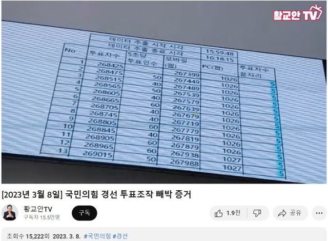 국민의힘 3.8 전당대회에 출마했던 황교안 전 국무총리 공식 유튜브 채널에, 이번 전당대회 당원투표에 대한 조작 의혹을 제기하는 내용의 동영상이 올라왔다.