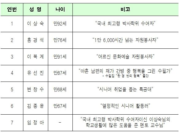 올해 2월, 학부를 졸업한 지 57년 만에 박사학위를 수여 받은 이상숙 어르신은 사회학 공부를 하고 싶었던 열정을 가슴에 품고 87세에 대학원 정규과정을 시작했다. 이상숙 어르신은 5년간 석·박사 과정을 모두 이수했고 만92세의 나이로 국내 최고령 박사학위를 취득했다. 나이에 대해 생각해 본 일 없이 하루하루가 배움의 연속이라는 마음으로 임했다는 이상숙 어르신은 졸업 후에도 계속 연구 활동을 할 예정이다.