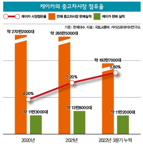 국토교통부와 카이즈유데이터연구소 데이터를 바탕으로 케이카가 공시한 최근 3년(2020~2022년 3분기까지) 연도별 시장점유율은 ▲2020년 4.2% ▲2021년 5.2% ▲2022년 3분기 5.8%다.