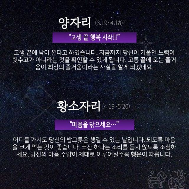 당신의 별자리를 생각하면서 기분 좋은 하루 성공하는 하루가 되게 해달라는 주문을 외워보세요. 당신이 생각하는 바가 다른 어느 때보다 강하게 이뤄질 수 있는 날입니다.