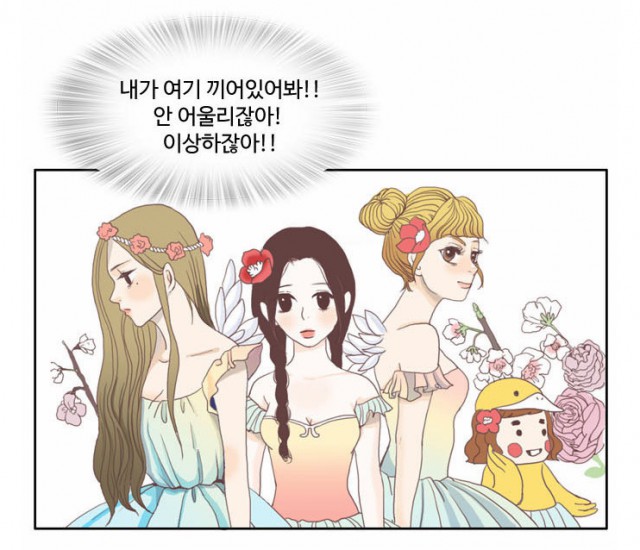 캐릭터를 그리다 보면, 처음에는 시작한 아이디어는 오리와 백조라는 아이디어에요. 나리가 등장할 때는 오리 캐릭터가 중간중간에 등장해서, 같이 나오는 개그 컷이 있었어요.