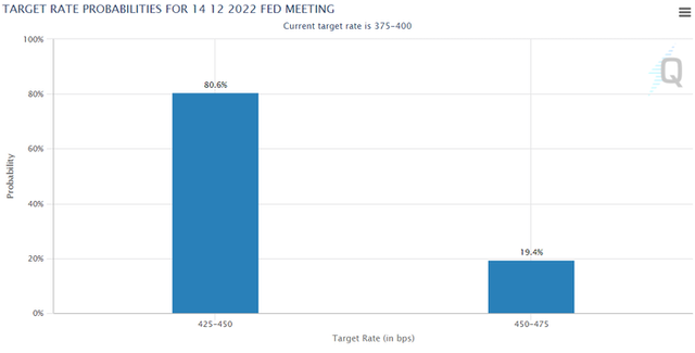 11월 14일(현지시간) 시카고상품거래소(CME) 그룹의 페드워치에 따르면 이날 오전 4시 22분 현재 미 연방준비제도(Fed·연준)가 12월 14일 예정된 공개시장위원회(FOMC) 회의에서 기준금리를 50bp(0.75%포인트, 1bp=0.01%포인트) 인상할 확률은 80.6%에 달했다. 반면 75bp 금리 인상 가능성은 19.4%에 그쳤다. 내년 3월에 기준금리가 4.75%~5.00%로 인상될 가능성은 46.6%를, 5.00%~5.25%로 높아질 가능성은 30.9%를 각각 기록했다. 현재 미국 기준금리는 3.75∼4.00% 수준이다.