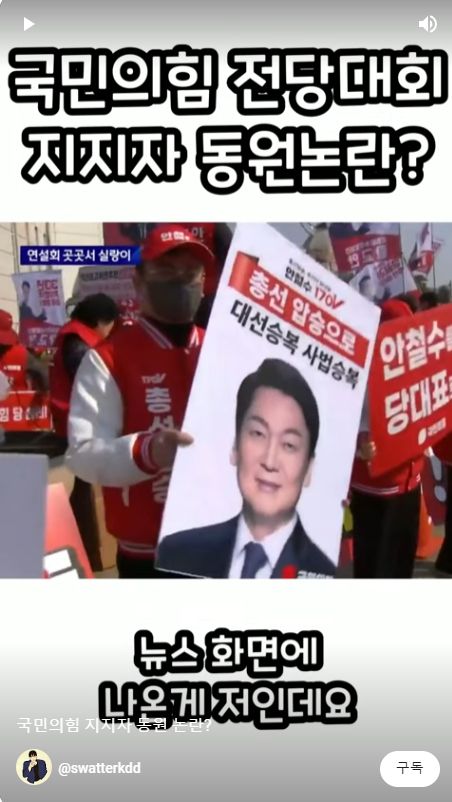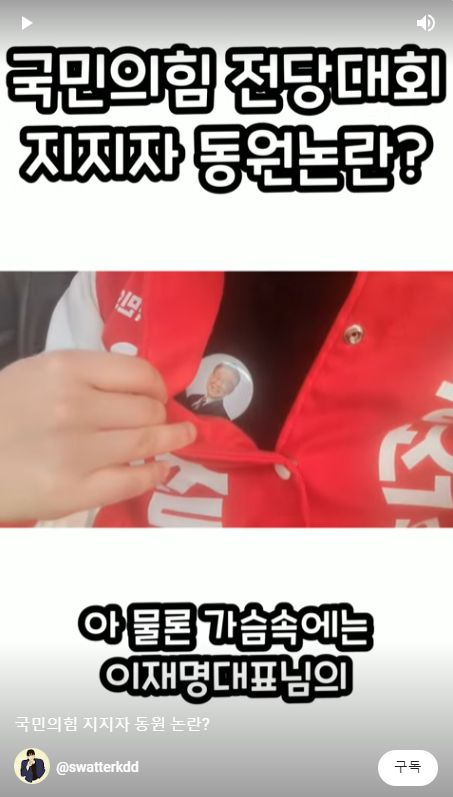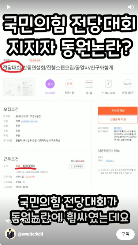 그는 "국민의힘 전당대회가 지지자 동원논란에 휩싸였다"며 "알바몬 채용공고에 전당대회 지지알바가 올라와 공정하고 상식적으로 안철수 지지 알바를 하고 왔다"고 밝혔다. 그는 민주당 7년차 권리당원이라고 밝히며 자신이 JTBC 뉴스 화면에 나온 것까지 캡처해 올렸다. 그는 "가슴 속에는 이재명 대표님의 뱃지를 착용하고 다녀왔다"고 덧붙였다.