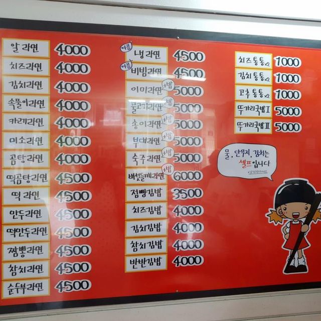 경복궁역 근처에 위치한 라면 맛집. 라면이 맛있으면 얼마나 맛있겠냐 하겠지만 이곳은 백종원의 3대 천왕, 맛있는 녀석들에 나왔을 정도로 라면을 잘 하는 집이다. 20가지가 넘는 다양한 맛의 라면을 즐길 수 있는데 참치라면, 버섯들깨라면 등 쉽게 볼 수 없는 메뉴를 맛볼 수 있다. 이곳의 시그너처인 ‘알라면’은 다른 라면과 다른 깊은 국물 맛에 얼큰함까지 더해져 해장 메뉴로도 제격. 김밥도 다양하게 준비되어 있는데 김밥과 라면 두 가지를 조합해 먹어도 만원 이하에 먹을 수 있으니 배부르고 부담 없이 한 끼 해결해 보자.