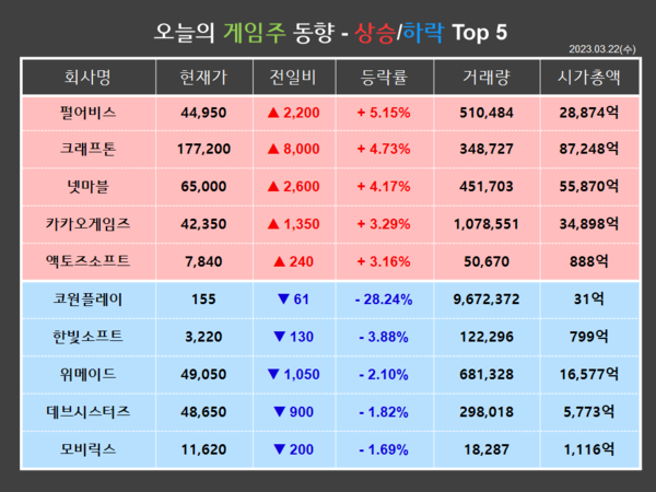 반면, 코원플레이는 금일(22일) 전거래일 대비 28.24%(61원) 하락한 155원에 장을 마감했다. 개인, 기관 외국인이 각각 44,818주, 5,135주, 1,851주를 순매도하며 종일 약세를 면치 못했다.