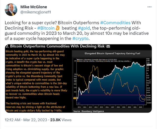 블룸버그 인텔리전스(Bloomberg Intelligence)의 마이크 맥글론(Mike McGlone) 상품 전략가가 비트코인(BTC)의 슈퍼사이클 시대가 도래했다고 주장했다.