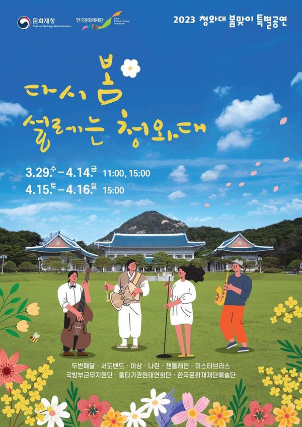 문화재청 청와대국민개방추진단은 한국문화재재단과 함께 오는 29일부터 다음 달 16일까지 ‘다시 봄, 설레는 청와대’ 문화예술공연을 선보인다고 23일 밝혔다.