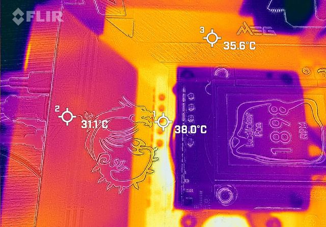 30분간 시네벤치 R23을 통해 진행한 후 전원부 온도는 FLIR 열화상 카메라 기준 전원부 히트싱크 온도는 낮게는 33.3도씨에서 높게는 36.8도씨를 기록했으며, 하드웨어의 정보를 실시간으로 확인할 수 있는 HWinfo64에는 VR(전압 조정기)온도는 47도씨였으며, MOSFET을 읽는 MOS에서는 약 41.5도씨 내외로 낮은 온도를 유지했다.