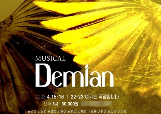 한편, 뮤지컬 '데미안'은 4월 15-16일, 22-23일 여기는 극장에서 오후 5시에 공연된다. 티켓 가격은 30,000원이다.