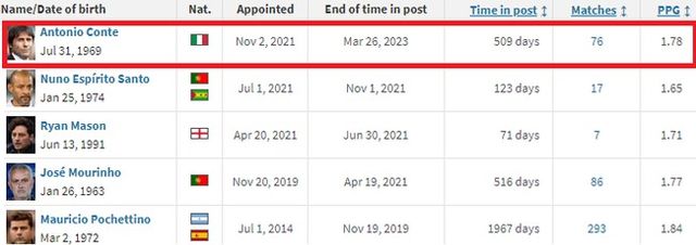 그렇다면 콘테 감독이 토트넘에서 남긴 성적은 어떨까. 509일 동안 모든 대회를 합쳐 76경기 41승 12무 23패, 136득점 85실점을 기록했다. 경기당 승점은 1.78점이다. 마우리시오 포체티노 감독(293경기, 경기당 1.84점)에 살짝 못 미치는 수준이다. 무관 탈출을 위해 거액을 투자했던 토트넘과 EPL에 야심차게 복귀했던 콘테 감독 모두 아쉬운 결말이다.