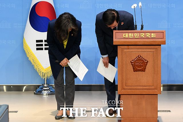 [더팩트ㅣ국회=남용희 기자] 윤영덕 더불어민주당 초선의원 모임(더민초) 운영위원장(오른쪽)과 강민정 의원이 19일 오후 서울 여의도 국회 소통관에서 2021년 더불어민주당 전당대회 '돈 봉투' 의혹 관련 기자회견을 열고 고개를 숙여 사과를 하고 있다.