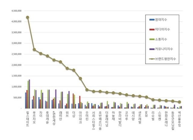 한국 아파트 브랜드평판지수는 소비자들의 디지털 행태를 평판 분석 알고리즘을 통해 참여지수·미디어지수·소통지수·커뮤니티 지수로 분석한 수치로 분석했다.