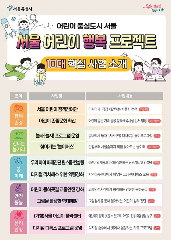 이번 프로젝트는 2010년 이후 태어난 만 13세 이하 알파세대 어린이의 행복에 초점을 맞춘 전국 최초의 종합계획이다. 이들의 행복을 키우고 건강을 지키기 위한 다양한 정책으로 채워졌다.