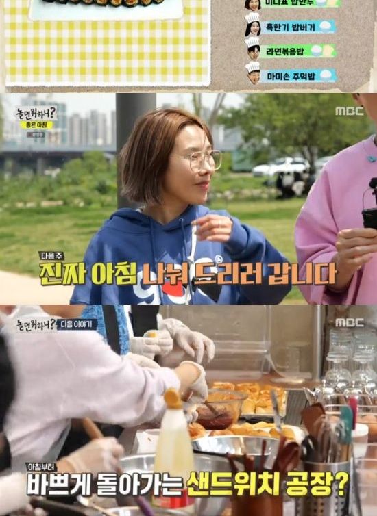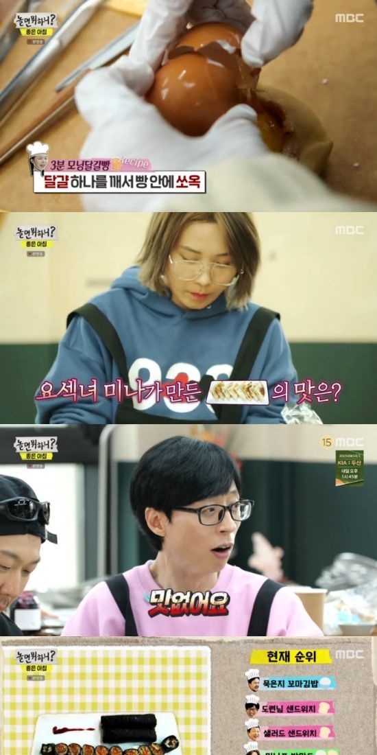 13일 방송된 MBC '놀면 뭐하니?'(이하 '놀뭐')에서는 '좋은 아침' 특집으로 꾸며진 가운데 박진주의 3분 모닝달걀빵과 유병재의 묵은지꼬마김밥이 아침 식사 메뉴 후보로 뽑힌 장면이 전파를 탔다.