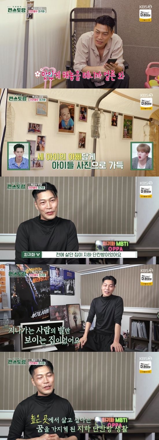 이에 대해 최귀화는 "전에 살던 집이 지하 단칸방이었다. 영화 '기생충'처럼 제 방에서 창문을 열면 지나가는 사람의 발만 보이는 집이었다"며 "지하에서 살다 보니까 높은 곳에서 살고 싶다는 꿈을 갖게 됐다. 이젠 확 트인 나만의 공간도 있고 아이들도 마음껏 하늘을 바라볼 수 있는 집으로 오게 됐다"고 말했다.