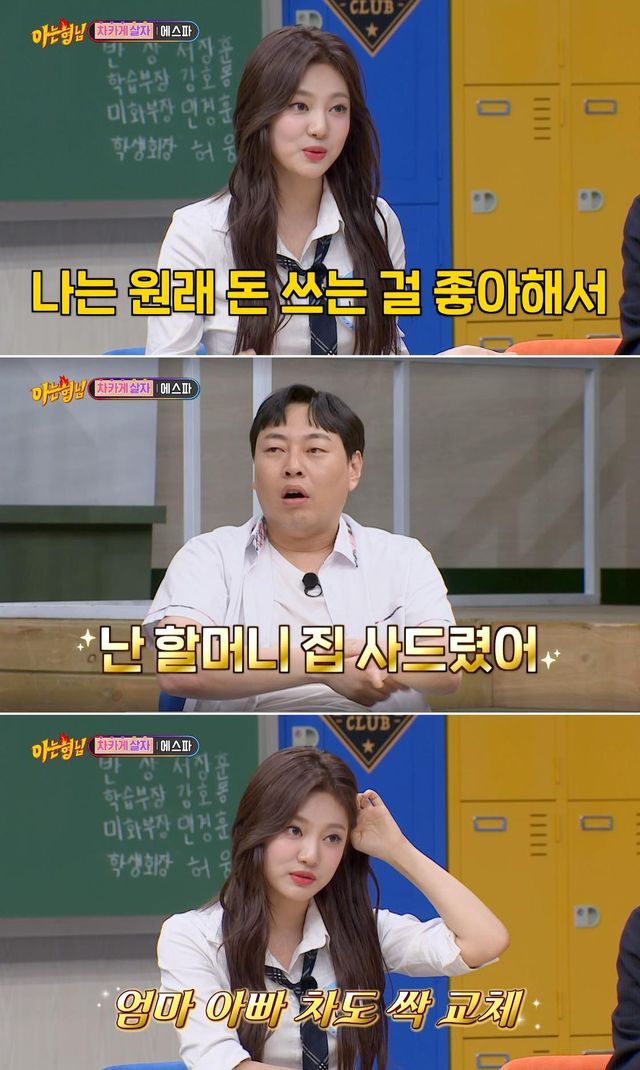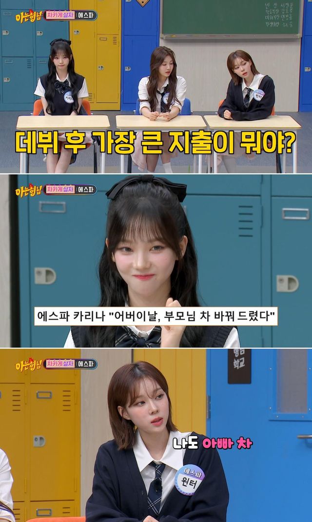 이후 에스파는 데뷔 후 가장 플렉스 한 경험에 관한 질문을 받았다. '아는 형님' 멤버들이 "부모님 차를 바꿔드렸다고 들었다"고 하자, 카리나는 "맞다"고 했고, 윈터 역시 "나도 아빠 차를 바꿔드렸다"고 말했다.
