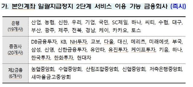 본인계좌 일괄지급정지 2단계 서비스 이용 가능 금융회사는 은행 19곳(산업, 농협, 신한, 우리, 기업, 국민, SC제일, 하나, 씨티, 수협, 대구, 부산, 광주, 제주, 전북, 경남, 케이, 카카오, 토스), 증권사 20곳(DB금융투자, KB, NH투자, 교보, 다올, 대신, 메리츠, 미래에셋, 부국, 삼성, 신영, 신한금융투자, 유안타, 유진투자, 케이프투자, 키움, 하나, 한국투자, 한화투자, 현대차), 제2금융권 6곳(농협중앙회, 수협중앙회, 산림조합중앙회, 신협중앙회, 저축은행중앙회, 새마을금고중앙회)이다.