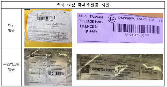 해당 소포는 노란색 혹은 검은색 포장지에 ‘CHUNGHWA POST’가 쓰여 있는 게 특징입니다. 발신지는 대부분 ‘P.O.Box 100561-1003777, Taipei Taiwan’로 돼 있습니다. 발신지가 말레이시아나 우크라이나, 우즈베키스탄으로 표시된 경우도 있다고 합니다. 소포 안에는 냄새가 없는 반죽 형태의 물체나 화장품 모양의 물건이 들어 있었던 것으로 파악되고 있습니다.