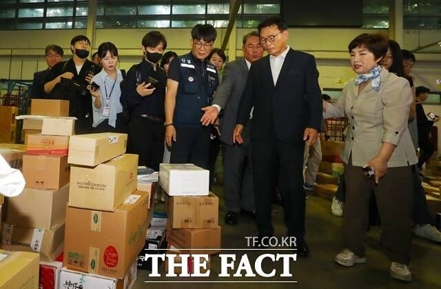 박광온 더불어민주당 원내대표가 1일 오전 서울 광진구 동서울우편물류센터를 찾아 폭염 속 우체국 택배 등의 분류작업을 하는 노동현장을 점검하고 있다. /뉴시스
