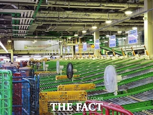 물류관리소 천장(에어컨), 머리 위 높이에 설치된 선풍기, 물류 이동 벨트 사이사이 마련된 선풍기 등 작업장 사이사이 냉방시설이 마련되어 있었으나 30도가 넘는 날씨에는 충분한 냉각 효과를 주지 못하는 듯했다. /송다영 기자