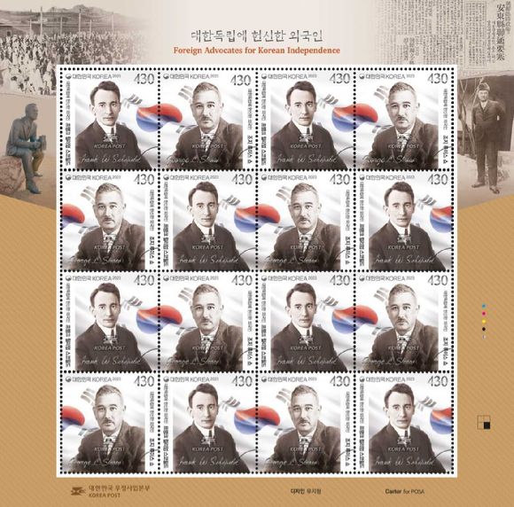 기념우표에는 프랭크 윌리엄 스코필드(1889~1970, 한국명: 석호필)와 조지 루이스 쇼(1880~1943) 초상이 담겼다. 우표 전지에는 스코필드가 3·1운동 당시 모습을 촬영한 대한문 앞 만세 시위 사진과 조지 루이스 쇼가 일본 경찰에 체포됐다는 1920년 8월 11일자 기사가 기록됐다.