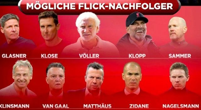 같은날 독일 '빌트'는 "누가 플릭 감독의 후임이 될 수 있을까?"라면서 후보군 10인을 공개했다. 매체는 올리버 글라스너, 미로슬라프 클로제, 루디 푈러, 클롭, 마티아스 잠머, 루이스 판 할, 로타어 마테우스, 지네딘 지단, 율리안 나겔스만 그리고 클린스만 감독을 리스트에 포함시켰다.