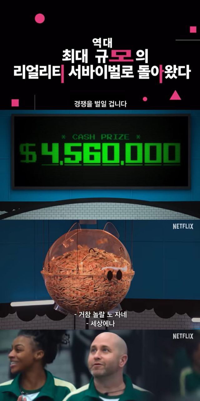 이어 "리얼리티 버전은 생사가 걸린 문제는 아니지만, 456명의 참가자가 리얼리티 TV쇼 역사상 가장 큰 상금인 456만달러(약 61억원)를 놓고 경쟁하게 된다"고 설명했다. 또 "일련의 게임에서 참가자들은 기회주의적인 동맹과 냉혹한 전략, 시기적절한 배신 등 승리를 위해 어디까지 갈 수 있는지 자신에게 묻게 된다"고 덧붙였다.