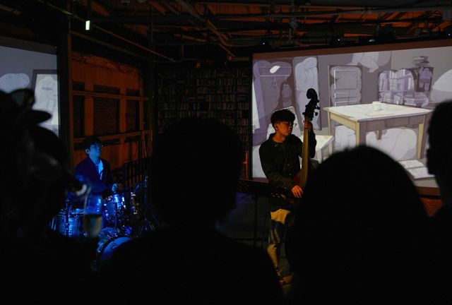 가장 눈길을 끈 건 역시 행사의 메인이라 할 수 있는 전시 공간이었다. 영화감독들이 기획한 공간이라는 건 그간 국내에서 만나기 어려운, 신선한 영감을 안겨주는 포맷의 전시였기 때문이다. 김지운 감독의 ‘희미한 옛 사랑의 그림자’는 앞서 말했듯 ‘평상’을 주요 오브제로, 그리움을 자아내는 다양한 영상과 소리, 물건들로 구성된 전시였다. 프로젝션 영상과 전시품들 틈틈이 평상이 들어차 있었는데, 재미있는 건 오전과 오후에 해당 전시 공간 분위기가 완전히 딴판이었다는 점이다. 전시 자체에는 바뀐 요소가 없으나, 처음에는 미술관에 온 듯 천천히 걸으며 세심히 디테일을 살피던 사람들이 점차 곳곳의 평상에 걸터앉아 서로 담소를 나누고 샴폐인을 마시기 시작한 것이다. 김지운 감독이 ‘우리가 잃은 것’이라고 생각했던 평상, 그 본연의 용도처럼. 연상호 감독의 ‘지옥’은 본인의 작품인 넷플릭스 시리즈 〈지옥〉의 세계관을 차용한 전시 공간이었다. 고시원 한 층을 최대한 사실적으로 조성하고 그 속에 ‘심판’을 받은 인간의 형상을 넣어, 일상과 비일상, 실재와 심리 세계가 뒤틀린 기이한 경험을 선사하고자 한 것이다. 극사실적으로 구현된 공간은 프라다의 세계적 행사를 구경하러 온 관람객들의 지적 즐거움에 이색적이고 무거운 한 층의 레이어를 더해주었을 뿐 아니라, SNS에서도 단연 화제를 모았다. ‘의자 위의 남자’ ‘빈 방’ ‘움직임의 사전’ 등 단편 애니메이션으로 칸 영화제, 안시 국제애니메이션 페스티벌 등에 초청되기도 한 애니메이션 감독 정다희가 선보인 건 애니메이션 제작자의 정신세계를 물화한 듯한 공간 ‘종이, 빛, 유령’이었다. 종이 위의 그림들과 디지털 패드 속의 영상들, 종이 위에 투사되는 애니메이션들은 종이라는 물질과 빛 사이의 연결을 직관적으로 전달하고 있었으며, 안쪽 깊숙이에는 벽장 가득 책과 영화 테이프가 들어차 있어 종이와 빛 뒤 창작자의 고민과 탐색의 시간도 느낄 수 있는 전시였다.