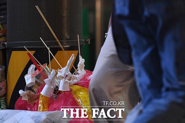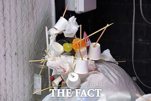 이동하며 먹다 보니 설탕 코팅과 과일도 거리로 떨어지고 꼬치와 종이컵 등 쓰레기가 여기저기 버려지기 마련.