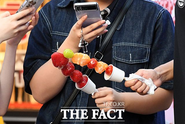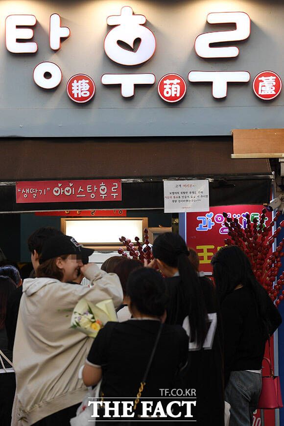 맛도 맛이지만 일렬로 꽂힌 과일에 설탕 코팅을 입혀 놓은 '예쁜' 탕후루를 받아 든 젊은이들이 꼬치를 들고 연신 카메라 버튼을 누르고 있었다.