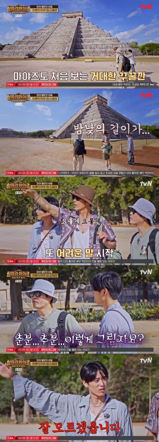 이어 차승원은 "춘분, 추분 밤낮의 길이가 똑같아질 때 뱀의 머리 위로 계단 옆에서 깃털 같은 그림자가 생기면서 내려오는 뱀의 형상이 나타난다. 그게 바로 날개 달린 뱀 꾸꿀칸이다"라며 치첸잇차 피라미드의 미스테리를 설명했다.