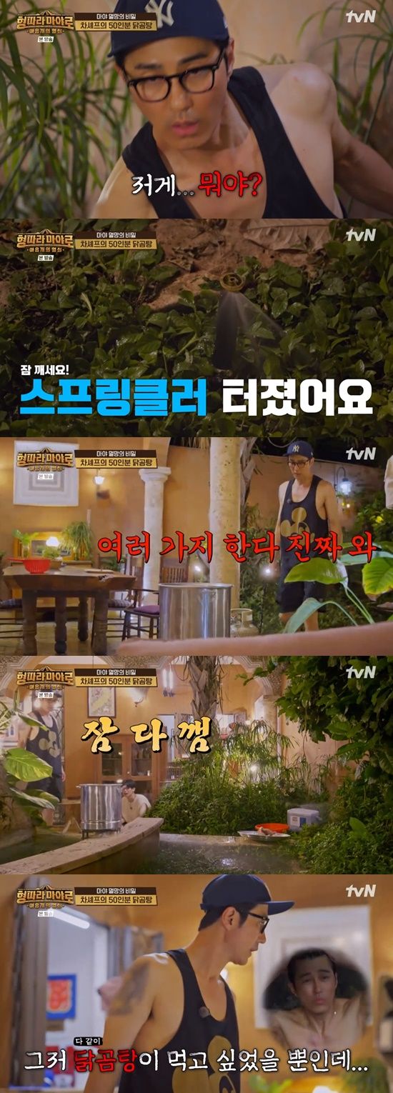 게다가 차승원이 수압이 낮은 싱크대를 피해 정원에서 닭 손질을 하는 사이 스프링클러까지 터져 버렸다. 차승원은 "여러 가지 한다. 숙소가 좋다 했더니 또 이런다"며 당황했다.