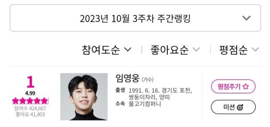아이돌차트에 따르면 지난 10월 20일부터 10월 26일까지 집계된 평점랭킹에서 임영웅은 42만 4667표를 얻어 최다득표를 기록했다.