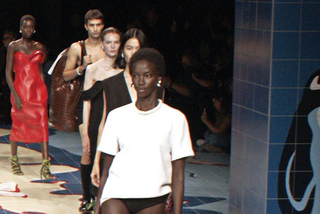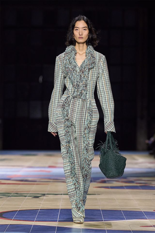 보테가 베네타 SUMMER 24 컬렉션은 런웨이 위 모델들이 마치 세계 여행을 하는 듯했다. 광활한 대륙과 바다로 꾸민 쇼 베뉴를 가로지르며 전 세계 곳곳을 넘나들었으니 말이다. “오디세이는 자유롭고 희망찬 여행이자 자신이 과거에 어땠는지, 앞으로 어떤 사람이 되고 싶은지, 그리고 앞으로 나아갈 방향을 이어주는 연결 고리예요. 여행은 외적이며 내적이고, 실재하는 동시에 상상할 수 있는 변화와 탈출의 여정입니다.” 마티유 블라지는 이번 시즌 테마인 여행을 은유적으로 표현하며 규칙에 얽매이지 않은 룩을 구현했다. 오프닝 룩은 언뜻 평범한 점프수트처럼 보이지만 니트 수영복으로 그의 아티스틱한 위트를 엿볼 수 있다. 그는 소재의 변주를 통해 다시 한번 ‘변화한다’라는 메시지를 전했으며, 이전 시즌에 공개한 옷을 벗어 오버사이즈 바스켓 인트레치아토 백 혹은 거대한 더플백 속에 넣고 비즈니스 스타일로 변신해 전복의 묘미를 선사했다.