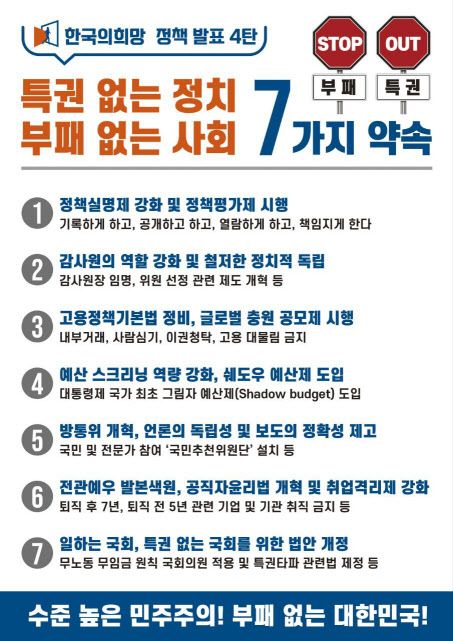 이를 위해 한국의희망은 △정책실명제 강화 및 정책평가제 시행 △감사원의 역할 강화 및 철저한 정치적 독립 △고용정책기본법 정비 및 글로벌 충원 공모제 시행 △예산 스크리닝 역량 강화 및 쉐도우 예산제(Shadow budget) 도입 △방송통신위원회 개혁 및 언론의 독립성과 보도의 정확성 제고 △공직자윤리법 개혁 및 취업격리제 강화를 통한 전관예우 발본색원 △일하는 국회·특권 없는 국회를 위한 법안 개정 등 총 7가지 정책대안을 제시했다.