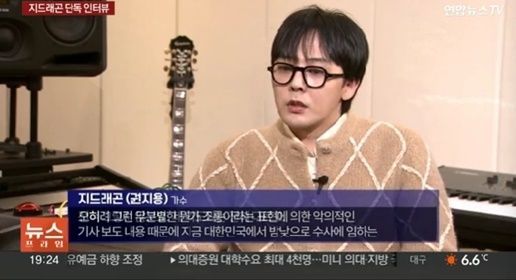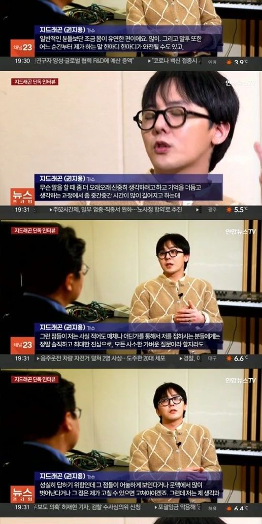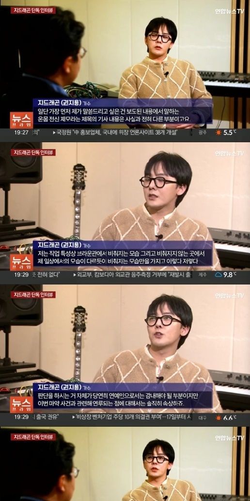 지드래곤은 13일 방송한 연합뉴스TV '뉴스프라임'과 인터뷰하면서 "나도 인터뷰를 결정하기까지 좀 고민을 많이 했는데 대중분들께 저의 결백함 그리고 올바른 전달을 하기 위해서 용기를 내서 결정하게 됐다"라고 말했다.