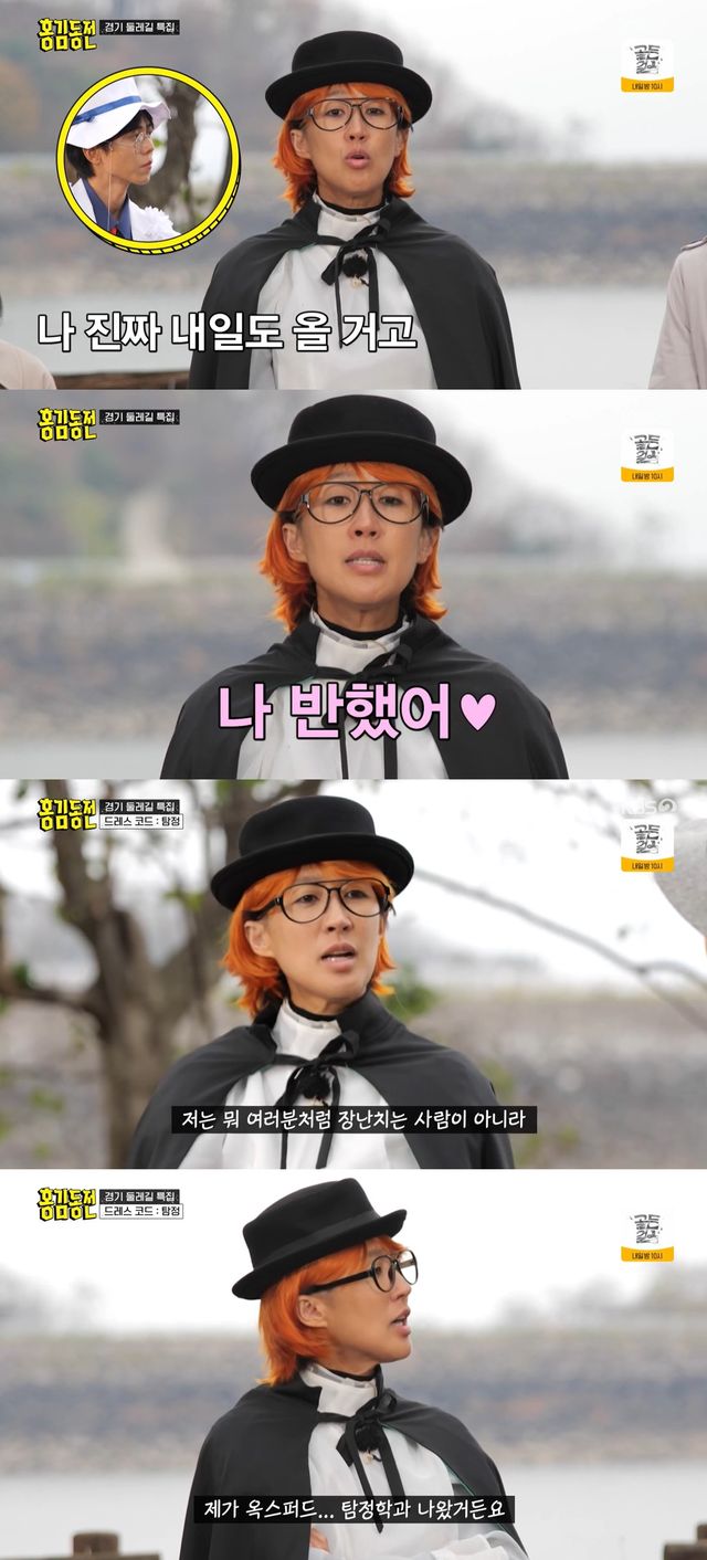 이날 탐정룩으로 드레스코드를 맞춘 멤버들은 경기 둘레길로 향했다. 우영은 "어떤 길을 걸어봤냐"는 물음에 "저는 아스팔트길을 걸어봤다"고 답했다. 김숙은 "저는 경기둘레길 많이 걸어봤다"고 했다.