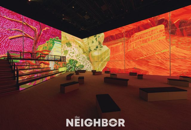 지난 2월 영국에서 개막 후 화제를 모은 데이비드 호크니의 미디어아트 전시가 서울에서 막을 올렸다. <David Hockney: Bigger & Closer(not smaller & further away)>는 ‘라이트룸 서울’ 개관과 함께 선보이는 몰입형 전시다. 약 50분 동안 호크니의 예술 세계가 넓은 전시실 안에 펼쳐진다. 4면의 벽과 바닥에 투사된 영상과 음향 효과 및 음악, 그리고 작가의 내레이션이 색다른 몰입의 경험을 선사한다. 전시는 6개 챕터로 구성되며, 원근법 실험, 무대 디자인, LA 체류 시절의 수영장 그림, 아이패드 드로잉 등 그의 관심사가 어떻게 변화해왔는지 집약적으로 확인할 수 있다. 무엇보다 자서전을 쓰듯 자신의 궤적을 돌아보는 작가의 목소리가 울림을 낳는다.