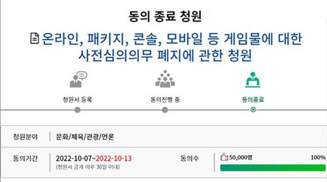 지난 2022년 10월 7일 '온라인/패키지/콘솔/모바일 게임 사전심의 의무를 폐지해 달라'는 국민동의 청원을 올렸고, 청원은 당시 게시 일주일 만에 소관 위원회 회부 조건인 5만 명을 달성했다.
