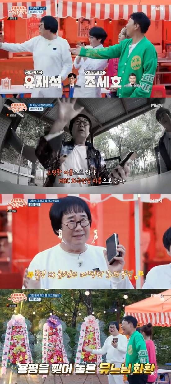 유재석이 전화를 받자, 팽현숙은 "고맙다"며 '유느님'의 화환에 감사를 전했다. 유재석은 "직접 가진 못했지만 진심으로 축하드리고 늘 저에게 많은 가르침을 주신 두 분이셔서 축하드린다. 녹화도 두 분이 하시기 때문에 보겠지만 대박 나시길 바라겠다"라며 응원했다.