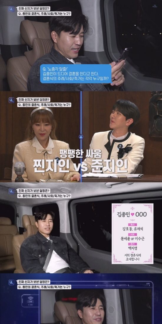 ‘가짜 신지’로 김수찬만이 남겨진 상황에, 김종민은 김수찬과 신지의 답변을 확인하고는 “둘 다 호동이 형이 들어간다. 이건 맞는데…”라면서도 묘하게 다른 답변에 고개를 갸웃거리며 고민에 빠졌다. ‘마스터 무’ 전현무는 “쫄린다...”라며 초조해했다. 다섯 명의 신지가 보낸 답변과 김종민의 최종 추측은 본 방송에서 공개한다.