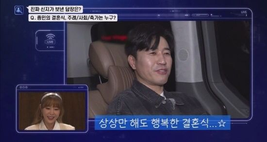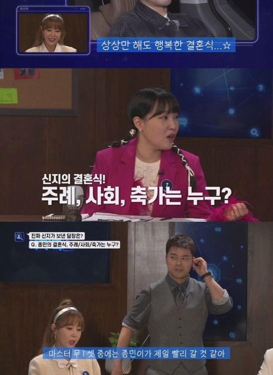 김종민은 “축사는 강호동 형과 유재석 형이 해주시면 좋겠다. 사회는 후보가 많은데...유세윤도 있고 이수근 형도 있다. 근데 축가는…백지영 누나 괜찮은데?”라며 결혼식 계획을 밝히며 아련한 눈빛을 보여줬다.