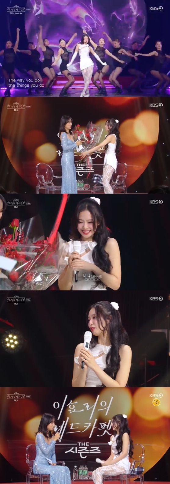이후 제니는 우상 이효리의 앞에서 '미스코리아' 무대를 선보였다. 이효리는 제니와 함께 즉석에서 합을 맞추며 레전드 디바 간의 좋은 케미를 보여 관객들의 감탄을 이끌었다.